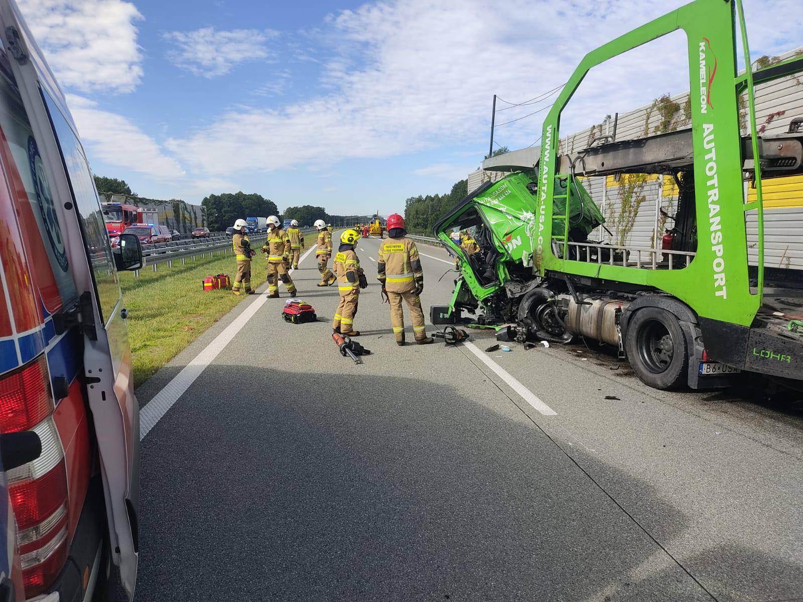 Kierowca lawety został zakleszczony w kabinie. Do jego ewakuacji konieczne było wykonanie dostępu przez straż pożarną przy użyciu narzędzi hydraulicznych. Po uwolnieniu poszkodowanego, na miejsce wezwano Lotnicze Pogotowie Ratunkowe – śmigłowiec (Ratownik 16) przetransportował rannego mężczyznę do szpitala.